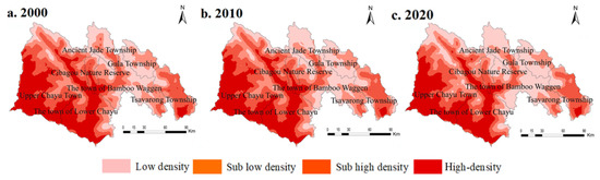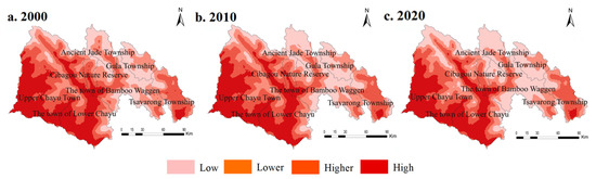 According to Figure 2, from 2000 to 2020, the county forest land accounted for the largest area, followed by grassland and unused land. The cultivated land distribution transferred gradually from the marginal area in 2000 to the inner river valley while the construction land was mainly distributed in the central area of each township, with the “strip” spatial distribution mainly in the Upper Chayu Town and Lower Chayu Town, and the increase in construction land in the past 20 years was small.