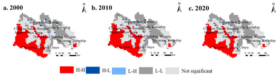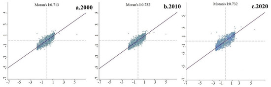 Moran’I scatter chart displays the spatial connection pattern between the regional and the surrounding unit attribute. What can be seen from Figure 6 is that the scatter points are mainly distributed in the first quadrant (HH) and the third quadrant (LL) while scatter points distribution in the second quadrant (LH) and the fourth quadrant (HL) is relatively small. Combined with the global Moran’I index, the chart indicates that the spatial distribution intensity of ESVI in different regions of the study area has a high spatial positive correlation and the distribution law is relatively consistent. From 2000 to 2020, the local Moran’I index increased first and then remained unchanged, combined with the situation that the scatters distributed along the trend line increased first and then remained unchanged, which reflected the trend of local spatial autocorrelation in the study area first increased and then remained unchanged.