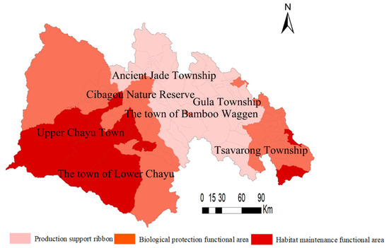 This type of area is mainly scattered in the central river valley adjacent to the two towns of Upper and Lower Chayu and the northeast of Tsavalong Township, besides, there are a small number of areas in the eastern part of Gula Township, involving a total of 26 administrative villages. The land use type is mainly forest land, part of the cultivated land and part of the construction land. With good water conservation capacity and strong food production capacity, it is the main cultivation and production area of the plateau animal husbandry and the plateau forest fruit industry. ESVI within this region is at a relatively low level throughout the county, and therefore, it is classified as production support functional areas. To protect this area, the measures are as follows. First, relying on the unique natural environment and special geographical advantages, emphasis should be laid on cultivating characteristic agriculture and high-efficiency agriculture. Meanwhile, it is necessary to strengthen the prevention and control of non-point source pollution in agriculture and animal husbandry, including the reduction in and control of chemical fertilizers and pesticides, and the prevention and control of livestock and poultry breeding pollution. Second, through multiple methods such as engineering measures, biological measures and agricultural measures, soil pollution control should be strengthened, and measures such as planting green manure and increasing organic fertilizer should be adopted to improve the soil environmental capacity and risk resistance. Third, the strictest system of cultivated land protection system should be implemented to ensure that the quality and function are not reduced, the protection of permanent basic farmland should be strengthened and the illegal occupation of cultivated land should be strictly prohibited, which are in accordance with the basic criterion of “adapting to local conditions, benefiting farmers, and ecological improvement” and focusing on the goal of “harmonious coexistence between man and nature and sustainable development of human society” to strictly adhere to the bottom line of grain production control.
