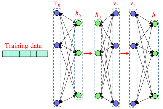 where are trainable parameters, n is the number of training data segments, and are the input vectors in visible and hidden layers, respectively, and E is the cost function.