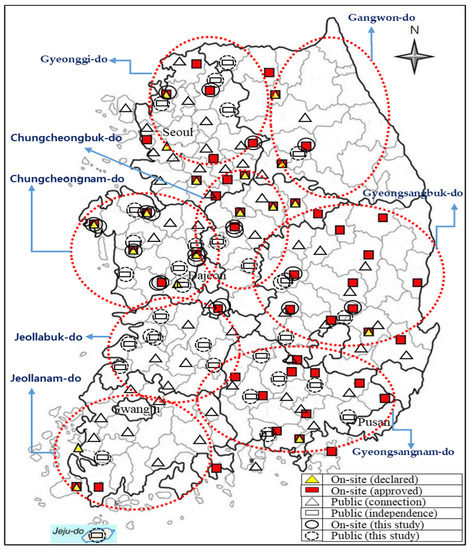 To investigate the water quality of swine-wastewater treatment facilities, targets were selected by identifying the operational status of public livestock manure treatment and individual, on-site treatment facilities (Figure 1). A total of 104 public treatment facilities were operating across Korea as of 2016 [20]. Of these, 32 on-site facilities were selected, and facilities connected to sewage treatment plants, recycling facilities for liquid fertilizers and compost, and bio-gasification were excluded. As of 2016, a total of 381 private, on-site treatment facilities were in operation, including 94 declared and 287 approved facilities [20]. Among them, 20 (~5%), were selected as target facilities.