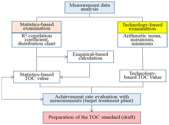 Figure 2 shows a schematic of the methodology used for standard-setting [20]. The proposed method included the identification of current data levels and a statistical review of the links between existing systems (e.g., BOD and CODMn) in the first step. The second step included a technology-based review of the ranges of TOC effluent concentrations that may be applicable during optimal operation. A water quality-based review by region and dilution/mixing with public waters is also available; while this technique requires the impacts of discharged effluent on public water quality to be assessed, it is impossible to quantify the TOC concentration of each pollution source that flows into public waters [20]. Additionally, because the fate of each pollution source cannot be clearly identified, calculating the contribution or impact of swine wastewater effluent is difficult. Thus, we substituted the water quality-based technique for the empirical method used in the United Kingdom and USA, which is based on percentiles of measured values [20].