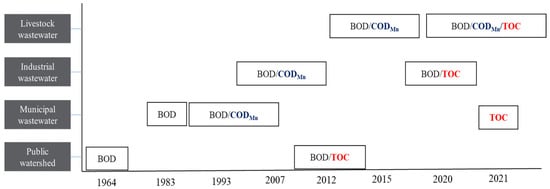 In 2009, the NIER presented directions for efficiently analyzing and managing OM in pollution sources and public waters and policies for reestablishing indicators through a comparative review of analytical methods for converting indicators of OM from CODMn to CODCr or TOC, comparative analyses of domestic and overseas OM management cases, and diagnosing current OM management conditions [20]. The NIER also presented problems and alternatives for investigating discharge facilities in 2012 through a survey of domestic and overseas cases in which proposed TOC effluent and wastewater discharge standards were set, conducted a pilot survey on TOC generation and discharge from public and individual discharge facilities, and proposed methods for setting TOC effluent and wastewater discharge standards in Korea [20]. The Ministry of Environment selected TOC as an indicator for managing organic pollutants in public waters and prepared management standards in 2012, while promoting policies that would reflect emissions standards (for effluent, wastewater, and total amounts of organic pollutants) after 2015. Total organic carbon discharge standards for sewage and wastewater were set in 2019 and implementation began in 2021 [20]. Figure 3 shows the changes in OM indicators and related policies according to relevant studies in each field in Korea. With the increasing need for ROM management in public waters, TOC was added to conventional BOD as an indicator of OM and the contributions of TOC to public waters from industrial wastewater, sewage treatment plants, and livestock manure have been measured. Through the conversion of OM indicators to TOC, the limitations of CODMn, which had been controversial for more than 40 years, can be resolved, providing a turning point for improving the efficiency of water quality management.