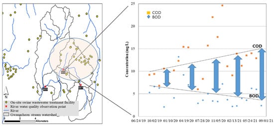Trends in the BOD and COD of rivers close to areas densely populated with swine farms highlight the importance of managing swine wastewater. Figure 4 shows the water quality measurements of a river close to an area densely populated with livestock farms (GC2; 0.99 facilities/km2) at Site A watershed, which was classified as a grade I (dangerous) area based on a survey of candidate sites. Survey results for BOD and COD trends over the past three years (2019–2021) show that BOD has continued to decrease, while COD has increased, indicating that the concentration of ROM has continued to increase. Similar cases are expected to occur frequently in areas densely populated by swine farms.
