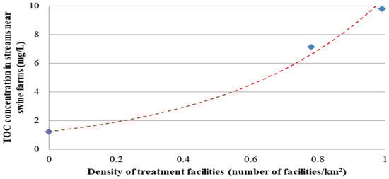 Concentrations of TOC in nearby streams according to the density of swine farms.