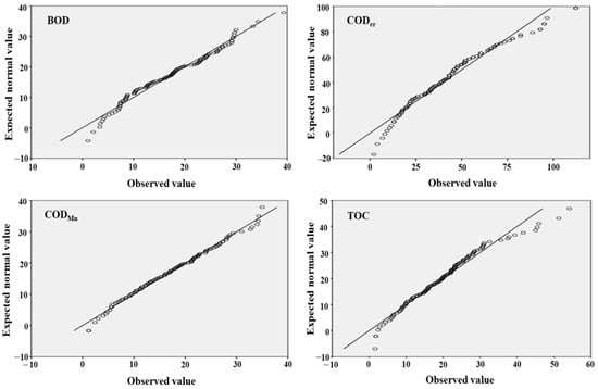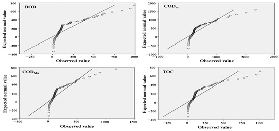 To determine whether or not the data for effluent from each swine-wastewater treatment facility were normally distributed, Q–Q plots were constructed (Figure 6 and Figure 7) and correlation analyses were conducted for each treatment facility based on these plots. Linearity in the data indicated a normal distribution, whereas nonlinearity indicated a non-normal distribution. As shown in the Q–Q plots, the measured OM parameters from public treatment facilities appeared nearly linear, with the data for CODMn exhibiting the highest degree of linearity, followed by that for TOC, BOD, and CODCr. In contrast, the OM parameters measured at on-site treatment facilities were nonlinear. Accordingly, it was determined that public treatment facilities followed a normal distribution, while on-site facilities did not.