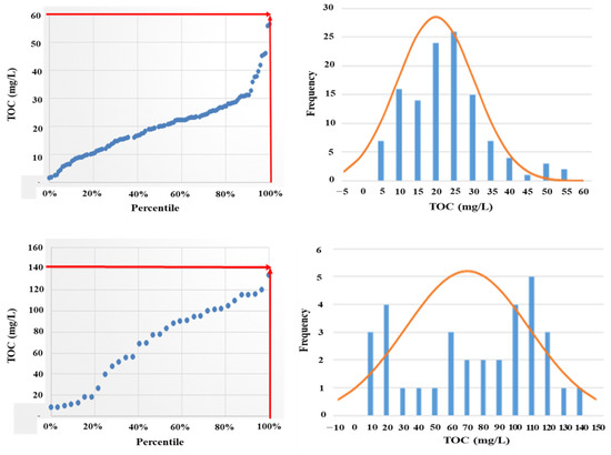 A review of the statistical and technology-based TOC standards revealed that there were no significant correlations among the OM parameters and that the technology-based standards were too strict. Accordingly, TOC values that could satisfy current OM standards (BOD and CODMn) were calculated (Figure 8). An empirical TOC standard-setting method was used to set the standard value within a certain percentile range. Typically, the standards for water quality parameters range from the 75th to the 90th percentile [45]. In Korea, the BOD standard has been set the lowest (70th percentile), while that for CODMn has been set at the 99th percentile [45]. The value representing the 99th percentile is used for public facilities to ensure that they can satisfy both the current OM and TOC standards, whereas the 100th percentile is applied to on-site treatment facilities, which may have difficulty removing refractory substances due to the absence of CODMn standards. If the difference between the 99th and 100th percentile values is large, there is a possibility of overestimation. However, our results showed that there was almost no difference between these values, and thus that no overestimation would occur even if 100th percentile values were used.