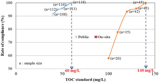 It is necessary to set a tentative TOC value from the results of the three methodologies considered thus far. The values ranged from 40–55 mg/L for public treatment facilities and from 120–160 mg/L for on-site facilities. The best way to determine the optimum standards is to evaluate their practical applicability, as the inability of individual farmers to comply with standards that have been set too high will result in the loss of the intended functions of said standards. One means of addressing this issue is to assess the rate of compliance so that standards may be set in order to achieve complete compliance without upgrading facilities; this can also facilitate standard-setting in the future. Figure 9 shows the rate of compliance for the tentative TOC standards calculated using each methodology. Assuming that swine-wastewater treatment facilities currently in operation are used as they are without further improvements, a TOC standard of 60 mg/L would be required for public facilities and 140 mg/L would be required for on-site facilities to satisfy the proposed TOC standards.