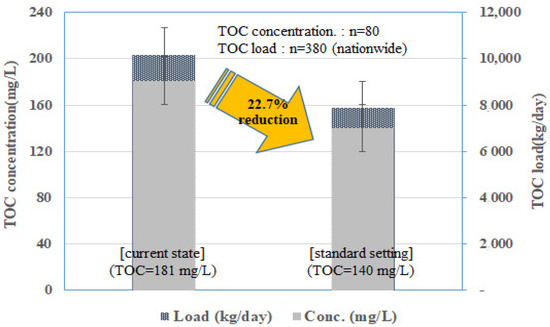 Limitations persist in predicting the degree to which water quality may be improved by setting TOC standards for swine-wastewater treatment facilities. Whether or not the facilities are operating stably can be evaluated through regular supervision and inspection and improvements to water quality can be determined via continuous monitoring of nearby rivers after setting the standards. Nevertheless, considering the concentration and flow rate of TOC discharged from swine-wastewater treatment facilities currently in operation and the TOC standards (assuming 140 mg/L) to be implemented in the future, a 22.7% reduction in TOC may be expected (Figure 10). A survey of 20 currently operating treatment facilities across four seasons showed that the mean amount of TOC discharged from on-site facilities was ~181 mg/L; assuming that the TOC standard will be set to 140 mg/L in the future, we found that the load would decrease by 2311 kg/day. While the impact of the calculated TOC reduction on the water quality of nearby rivers can be evaluated via monitoring, simply reducing the discharge of TOC from treatment facilities (by ~25% of the current level) alone may ultimately have a positive impact on river water quality.