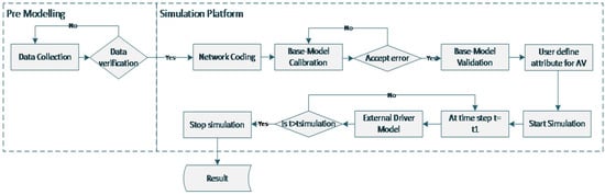 A three-lane motorway section (in each direction) in Al-Madinah, Saudi Arabia served as a test environment. Conventional vehicles consisting of 98% base case cars with a common desired speed distribution (90–100 km/h) and 2% of trucks with a standard desired speed distribution (80–90 km/h), and AVs with a constant desired speed (80 km/h), were utilized for each MPR case (PTV, 2021). The overall architecture of the proposed simulation framework is presented in Figure 1.