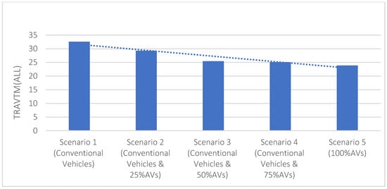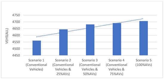 To evaluate the performance of AV technologies on the arterial section, five MoEs were used (the number of stops, average stopped delay, vehicle capacity, vehicle delay, and travel time). To minimize the effect of the stochastic nature of the Vissim, each scenario was run seven times [] for 4200 s each, including warm-up and cool-down periods lasting 300 s. To evaluate the operational traffic performance of AVs in terms of capacity, travel time, and travel delay, Figure 3, Figure 4 and Figure 5 represent vehicle capacity, travel time, and vehicle delay.