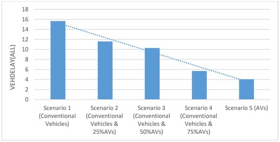 Results of the average vehicle delay look relevant to the output of the average travel time. Vehicle delays were reduced by 26%, 34.4%, 63.7%, and 74.2%, when the traffic stream consisted of 25% AVs, 50% AVs, 75% AVs, and 100% Avs, respectively.