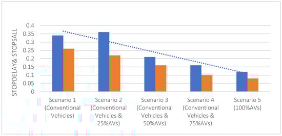 To evaluate the safety performance of AVs, Figure 6 represents the overall segment of average “stops all” and “stop delay” for all scenarios.