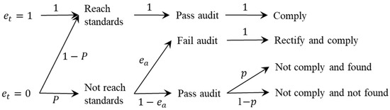 Morais, et al., performed audits in the food industry to evaluate the energy consumption of the equipment, and presented several measures and best practices for the improvement of energy efficiency [30]. In the literature on responsible supply chain management, Chen and Lee [16] found that when the supplier has responsibility risk, the buyer uses the process audit to identify penitential problems to reduce the sourcing risks. Caro, et al. [31], compared three types of audit mechanisms of buyers, including the buyers conducting their respective audits, buyers conducting audits jointly, and each buyer conducting audits independently and sharing their audit reports. Plambeck and Taylor [32] explored the phenomenon of the supplier’s evasion of a buyer’s audit, which is caused by the supplier’s hiding effort when the supplier has caused major harm to workers or to the environment. Process audits were also used to improve the supply and quality of agents. Nikoofal and Gümüş [33] examined the effectiveness of auditing the hidden actions of the supplier, in regard to the buyer, when the supplier was privately aware of the supply risk. Nikoofal and Gümüş [18] characterized the value of output- and action-based incentive mechanisms adopted by manufacturers to control the quality of suppliers when privately informed of the risk of failure.