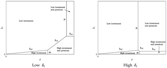 Figure 3 shows the three strategies and threshold lines, , , and . From Figure 3, as increased, the 4PL preferred the low-investment strategy to the low-investment-and-premium strategy, when the investment cost, , was high, or changed from the low-investment strategy to the high-investment strategy, and then to the low-investment-and-premium strategy, when the investment cost, , was low. Thus, as the goodwill cost, , increased, the 4PL’s strategy choice increased the probability that the logistics activity complied with the environmental regulations.