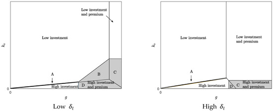 Figure 3 illustrates that the threshold lines, and , shifted to the left when the ratio of losing future orders, , increased. Thus, the 4PL preferred the low-investment-and-premium strategy. This was because when was higher, the 3PL suffered a higher loss, due to making no efforts, resulting in a higher premium, , that the 4PL paid to incentivize the 3PL to make efforts.