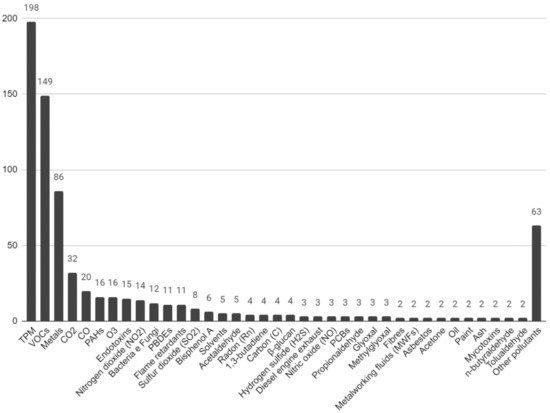 From our NVivo analysis, we identified a total of 153 types of pollutants examined in the literature. Figure 2 shows the number of times a pollutant was considered in the collected papers.