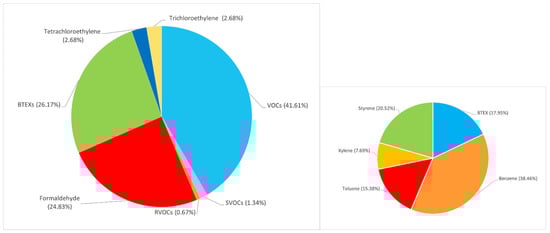The group “Other pollutants” includes the 63 that have only been detected once, such as Cytochrome P450 2E1 (CYP2E1) [36], Polytetrafluoroethylene (PTFE), Acrylamide [37], Hydrochloric acid [38], Nitric acid (HNO3) [39], Isocyanic acid [40], Selenium (Se), Triglycidyl Isocyanurate (TGIC) [41], and Vinyl chloride monomer [42]. As the graph shows, the first three categories of TPM (Total Particulate Matter), VOCs (Volatile Organic Compounds), and Metals correspond to 59.81% of the total investigated pollutants in indoor environments. Nurul et al. [43] assessed the levels of particulate matter ((PM2.5, PM10, and Total Particulate Matter (TPM)) and traced metal dust concentrations in different sections of a steel plant and compared them with the occupational exposure values. Particulate matter is classified according to the size of the particle: coarse particulate matter, PM10 (particles with a diameter of 10 micrometers (μm) or less); fine particulate matter, PM2.5 (particles with a diameter of 2.5 micrometers (μm) or less); PM1 (particles with a diameter of 1 micrometer (μm) or less); and ultrafine particulate matter, PM0.1 (particles with a diameter of 100 nanometers (nm) or less). The findings showed that chromium and cobalt exposure exceeded the recommended limit by one to three times, but nickel exposure and particulate matter (PM2.5, PM10, and TPM) did not exceed the limit [44]. Unacceptable work conditions, such as a lack of engineering control, and unsafe behavior, such as no respiratory mask use, were found to be potential contributors to the higher exposure to metal dust among the workers. Improvements in working conditions and in safety behavior are thus required to ensure the well-being of these workers. The authors of [45] reported the occupational inhalation exposure of workers to VOCs in the Kuwaiti printing industry. VOCs are particularly dangerous to human health [46]. The researchers’ results indicate that efforts to reduce worker exposure to VOCs in recent years have been successful, but there is still much to be completed to protect them. Unexpected findings included the use of the carcinogen vinyl chloride and 1,2-Dichlorotetrafluoroethane (CFC-114), which is banned under the Montreal Protocol, in printing activities. Lapses in safety procedures were observed, including the failure to use ventilation systems or closing doors between work areas, indicating that management and worker education should remain a priority. These categories can be considered macro-areas containing different variants of the same main element. The composition of each macro-area is shown below. Figure 3 shows the elements that appear in the “VOCs” macro-area. Many authors (41.6%) who analyze VOCs do not provide information about their composition. Formaldehyde is the focus of many studies, as a typical pollutant of indoor environments, and is found in materials used for the insulation of buildings and furnishings. BTEXs (Benzene, Toluene, Ethylbenzene, Xylene) are also widely studied, such as Benzene [36,37], Styrene [47,48], and Toluene [49]. Tetrachloroethylene and Trichloroethylene are also analyzed to a lesser extent.