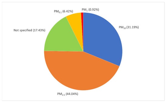 The macro-area of TPM consists of the two sub-categories of PM (55.05%) and Dust (44.95%). Figure 4 shows the composition of the “PM” macro-area. PM2.5 (44.0%) and PM10 (31.2%) are the most often considered PMs in terms of both the indoor and the outdoor environment. The authors of [50,51,52] carried out an analysis of the hazard quotient (HQ, or quotient of danger) and the cancer risk (CR) of PM2.5 in cases of chronic exposure. Five offices were considered, and a comparison was made between the indoor and outdoor environments. The hazard quotient (HQ) associated with PM2.5 was, in all five cases, higher in the indoor than in the outdoor environment. The authors of [53] analyzed the air quality level in 13 open-plan administrative offices (OAOs) and 12 open-plan research offices (OROs) in China. The concentrations of PM2.5 and PM10 in the OAOs were 55.0 μg/m3 and 68.8 μg/m3, with 60.9 μg/m3 and 74.6 μg/m3 in the OROs, respectively. As recommended by the BS EN Standard 15251:2007 [54] and ANSI/ASHRAE Standard 62.1–2013 [55], the concentrations of PM2.5 and PM10 should be lower than 15 μg/m3 and 50 μg/m3, respectively. This therefore indicates that the concentrations of PM2.5 and PM10 did not satisfy the requirements of these standards. The authors of [56] studied the inhalation exposure to size-specific particulate matter (PM) among workers in an informal electronic-waste (e-waste) recovery site. Burning activities led to the highest PM2.5 exposure (203 μg m3). However, median PM2.5 concentrations between work- and non-work-related activities were largely similar, and all individuals on the site, regardless of their activities, experienced poor air quality. PM2.5 exposures during long periods of non-work-related activities exceeded the WHO standard in 88% of the measured data.