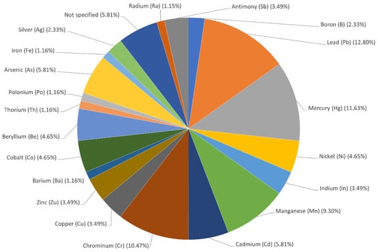 Figure 6 shows the composition of the “Metals” macro-area. The incidence of studies that investigated metals is well-balanced in terms of types of metal. Lead was investigated in 12.8% of the studies, for example, by [63]; mercury was investigated in 11.6%, for example, by [64]; the presence and effects of chromium were evaluated, for example, by [65]; and [66] analyzed the exposure to solid chemical agents in biomass-fired power plants and the associated health effects. The MIXIE program was used to evaluate the risks the workers faced from the metals. The results suggest that multiple 4exposures to different metals are associated with an increased risk of cancer, central nervous system disorders, and upper and lower respiratory tract irritation. The increased cancer risk can be explained by the combined effects of As, Be, Cd, and Pb; central nervous system disorders by those of Mn, Pb, and Se; irritation of the upper respiratory tract by those of Al, As, and Se; and irritation of the lower respiratory tract by the combined effects of Be, Cd, Mn, and Se. The most evident exposure-associated health risk of multiple exposures to metals was that of cancer.