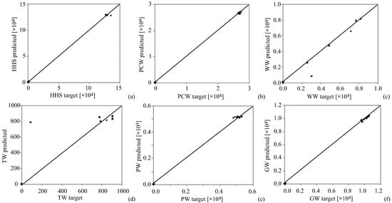 Collected data and data anticipated by the ANN model: (a) HHS, (b) PCW, (c) WW, (d) TW, (e) PW and (f) GW.