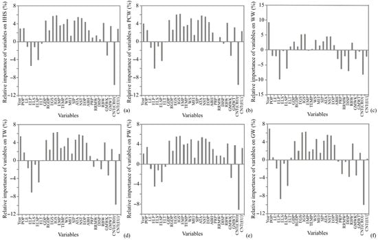 The relative importance of the input variables on: (a) HHS, (b) PCW, (c) WW, (d) TW, (e) PW and (f) GW, determined using the Yoon interpretation method.