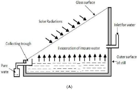 Solar stills employ the same processes encountered in nature for rainfall generation (i.e., evaporation and condensation). In this device, the impure water is placed in a container. The solar radiation crosses the glass cover and is then absorbed by the lower surface, which is coated with black paint. The absorbed radiation is converted directly into heat. This heat is absorbed by seawater, and partial evaporation of it takes place; the evaporated seawater is then condensed into distilled water on the internal side of the cover. After that, the drops of the distilled water begin to slide down due to gravity and are collected at the bottom of the inclined transparent cover [15]. Whereas the evaporated water leaves all the contaminants in the basin.