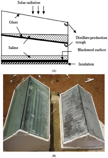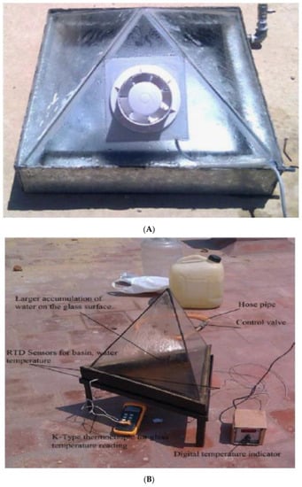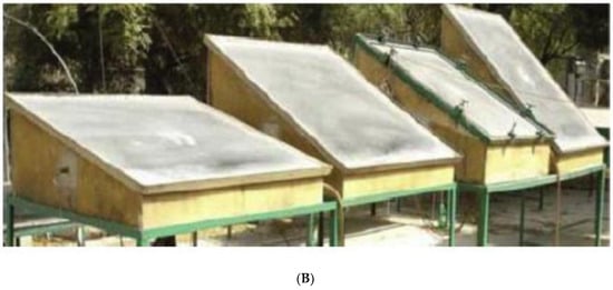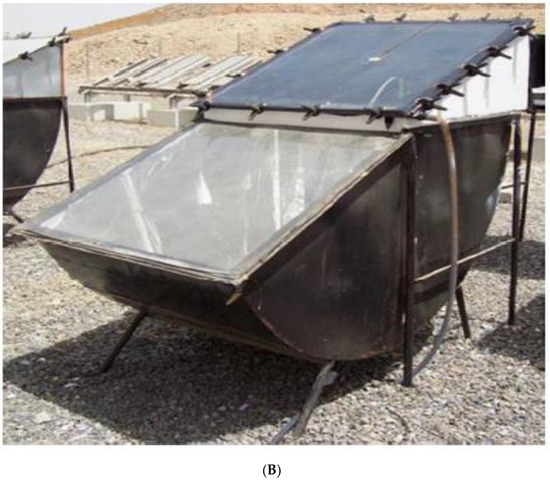 Sketch and photo of the double slope basin solar still. (A). El-Maghlany [30], “Reprinted/adapted with permission from Ref. [30]. 2012, Elsevier”. (B). Hanane et al. [31], “Reprinted/adapted with permission from Ref. [31]. 2002, Elsevier”.