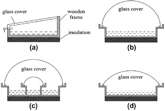 Sketch of the conventional basin solar stills with different glass covers (Tayeb [23], “Reprinted/adapted with permission from Ref. [23]. 1992, Elsevier”). (a) Sloped flat cover, (b) Half cylinder cover, (c) Two half cylinders cover, (d) Slightly curved cover.