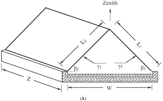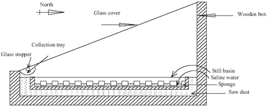 According to these values, an area of one square meter as a minimum is needed to provide the essential needs of one person [22]. This poor efficiency is caused by the condensation heat losses to the surroundings throughout the glass cover; some useful heat is carried away by the warm condensate. At higher and lower latitude locations, a single-slope solar still collects a greater amount of radiation than a double-slope solar still. Figure 2 (Tayeb [23])) presents a sketch of the basin solar stills with different glass covers. However, the productivity of this type can be improved by using sponge cubes [24], as presented in Figure 3 (Abu-Hijileh and Rababa’h [25]). Also, it can be improved by using an integrated natural circulation loop [26] or a phase-change material [27]. In any case, the single-slope basin solar still has some disadvantages, such as [28]: