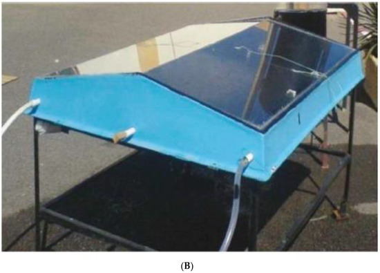 Basin type solar still with internal and external reflectors: This type consists of a basin liner with internal reflectors, a glass cover, and an external reflector, as depicted in Figure 8 (Tiwari and Tiwari [44]). The main advantage of using these reflectors is to permit additional radiation to be introduced to the solar still. Therefore, the daily productivity was enhanced by 70–100% in winter compared to standard basin solar still. Solar reflectors are known for their high solar radiation concentration; therefore, they are always recommended for use in areas with weak solar radiation or low temperatures [45]. The configuration flexibility of the absorber plate is improved by using external reflectors which redirect the solar beams [46,47]. The reflectors are normally constructed from extremely reflective materials (e.g., mirror-finished metal plates). The external reflectors tend to enhance both direct and diffuse radiation transmitted through the glass cover. Figure 8 shows also a photo of this type of the solar still (Tanaka [46]).