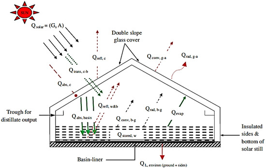 Double-slope basin solar still (roof or greenhouse type): The basin in this type of still is airtight; it is normally constructed from concrete, galvanized iron sheet, or fiber reinforced plastic with a top transparent cover [29]. In order to be able to absorb maximum solar radiation, the base is painted in black. The distillate output is collected at the lower ends of the top cover. The saline is fed inside the basin for purification by using solar energy. Figure 4 (El-Maghlany [30] and Hanane et al. [31]) presents a sketch and photo of the double-slope solar still, while Figure 5 (Ranjan and Kaushik [16]) shows the mechanism of energy transfer of the still. The key benefit of this type of distiller is the low production cost of clean water for household applications. This is due to the following reasons [32,33,34,35]:
