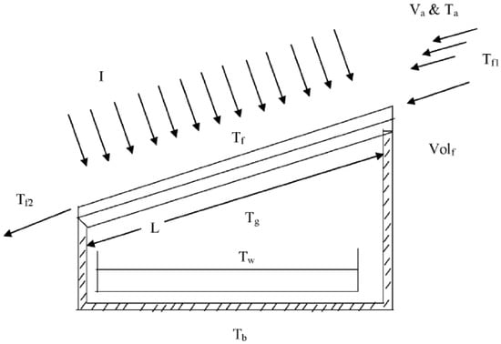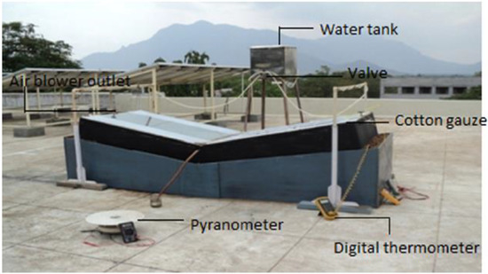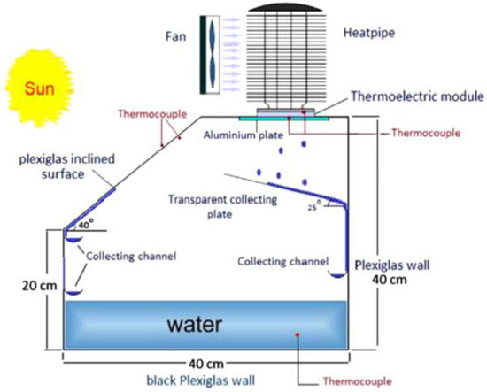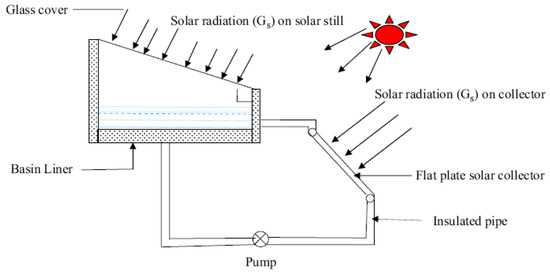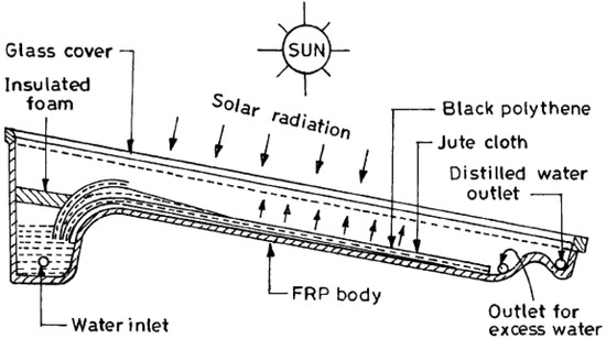 Sketch of the solar still integrated with a flat plate solar collector (Ranjan and Kaushik [16], “Reprinted/adapted with permission from Ref. [16]. 2013, Elsevier”).