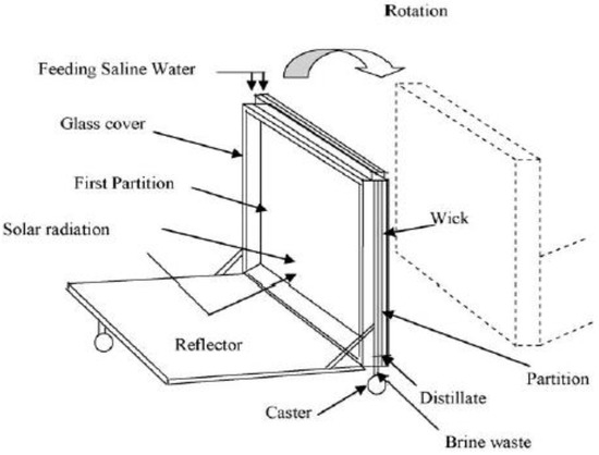 Multiple effect diffusion solar still: It comprises a glass cover, flat-plate reflector, casters for manual azimuth tracking, and a number of vertical and parallel partitions with narrow air gaps of a few millimeters between partitions, as shown in Figure 7 (Tanaka et al. [39]). This type has high productivity because of the use of latent heat with an added advantage of cost savings. For more details about the multiple effect diffusion solar still, the reader can refer to articles by Tanaka et al. [39] and [40,41]. This type can be improved by adding a vacuum-tube collector and heat pipe [42]. It has many advantages, such as [43]:
