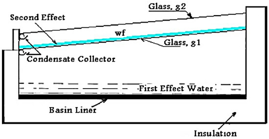 Double-basin solar still: In this type, an additional glass sheet is placed in-between the basin liner and the glass cover (Figure 10 (Al-Karaghouli and Al-Naser [52] and Elango and Murugavel [53])). The main purpose of this added glass sheet is to be used as an additional basin for the saline water. Therefore, the assembly of this still is considered as two simple basin solar stills, with one basin located on top of the other. The productivity of the still is enhanced by the proper employment of the latent heat of vaporization [54].