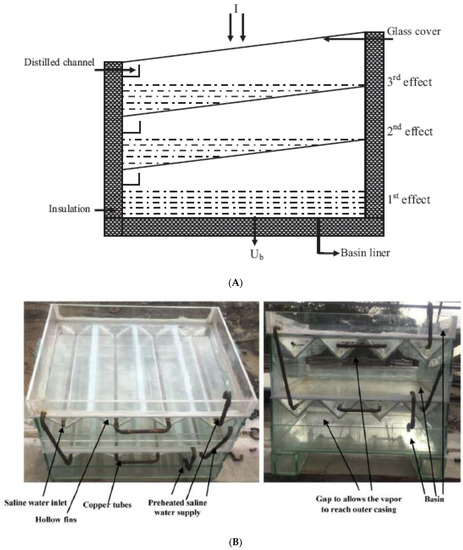 Sketch and photo of the triple basin solar still. (A). El-Sebaii [55], “Reprinted/adapted with permission from Ref. [55]. 2005, Elsevier”. (B). Srithar et al. [56], “Reprinted/adapted with permission from Ref. [56]. 2016, Elsevier”.