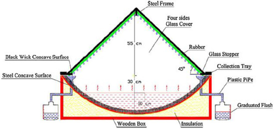 Schematic diagram of concave wick surface solar still (Kabeel [86], “Reprinted/adapted with permission from Ref. [86]. 2009, Elsevier”).