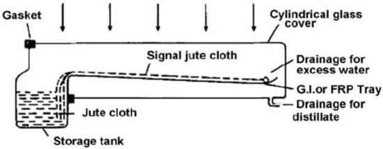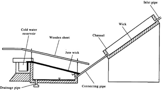 Multi-wick solar still: this is a passive solar still (Figure 16 (Tiwari et al. [9])); the brine flows slowly over a tilted surface covered with a thin layer of wicks. Since the flowing brine has a low heat capacity, it evaporates quickly. In this type, black wet jute cloth represents the liquid surface that could be easily oriented in order to obtain the maximum radiation, and thus a limited amount of water is heated to high temperatures leading to rapid evaporation. The multi-wick solar still has some merits, such as [84,85]: