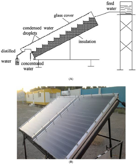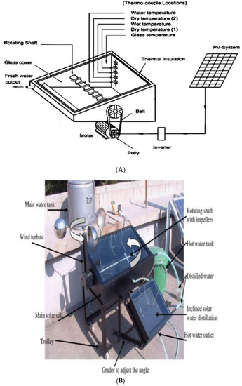 Sketch and photo of the solar still coupled with an external condenser. (A). Tiwari et al. [9], “Reprinted/adapted with permission from Ref. [9]. 2003, Elsevier”. (B). Emad [93], “Reprinted/adapted with permission from Ref. [93]. 2014, Elsevier”.