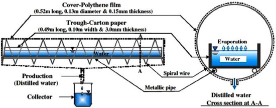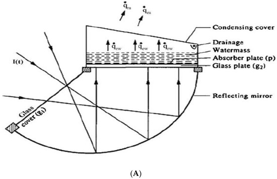 Sketch of the solar still integrated with a (CPC) collector (Tanaka [63], “Reprinted/adapted with permission from Ref. [63]. 2011, Elsevier”).
