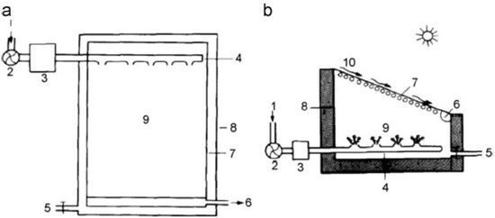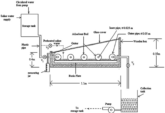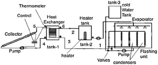 - Pre-heated water active solar distillation: the water basin’s temperature is raised using pre-heated water. The waste hot water can be obtained from different sources such as chemical or food industries and thermal power plants. It is directly delivered to the basin or through heat exchangers. This technique can be used to increase the still productivity by about 3.2 times compared with the conventional still [12,13].