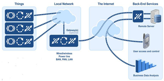 The IoT bridges the physical and digital world, resting on the worldwide interconnection of public and private networks that use the standard Internet protocol suite (TCP/IP). It is a network of physical devices embedded with technologies connected to the Internet that work together for data interoperability [25,30,31]. According to the International Telecommunication Union report [2], the IoT is an infrastructure designed for hyperconnected societies that are facilitated by information and communication technologies to create an ecosystem that connects the Earth’s four subsystems: the lithosphere (land), hydrosphere (water), biosphere (living things), and atmosphere (air). The principle behind this infrastructure is to unify the Earth’s subsystems on a common platform to gain insights into operations by expanding and utilizing real-time self-reporting devices for interaction, collaboration, remote tracking, manipulation, and control.