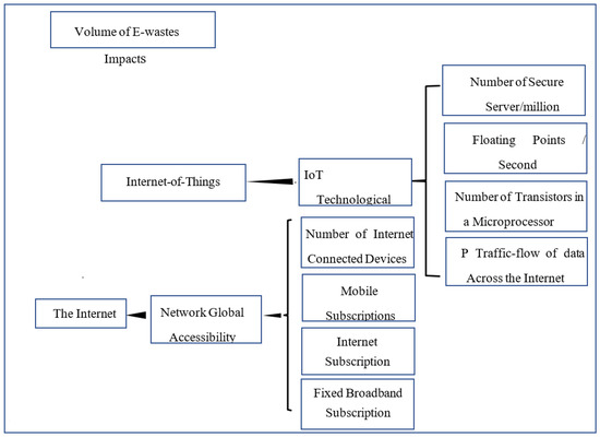 Based on an extensive literature review, two propositions were advanced to provide a framework for testable procedures: Proposition One—the Internet positively influences the variability in the volume of e-waste; and Proposition Two—the Internet-of-Things positively influences the variability of the volume of e-waste. These two propositions relate to the Internet infrastructure along several dimensions, such as scale, performance, accessibility, and functionality, which have materialized in the IoT and are largely attributable to satisfying basic industrial and community needs. Utilizing electronic devices effectively pushes the internet infrastructure forward for the proliferation and commercialization of the Internet. Thus, the Internet has become a commodity service with the attention on using it as a global information infrastructure to support commercial and non-commercial services. However, it has also escalated environmental challenges through discarded IoT devices called e-waste.