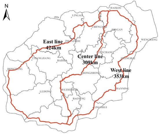 For this article, we chose Hainan Island in southeastern China as a case study. Hainan Island is known as the “Hawaii of the East” and is one of the world’s most important tropical destinations, with rich tourism resources, well-organized cycling, and excellent infrastructure [50]. As of 2020, including the third top international cycling event in Asia, the “Tour de Island”, China’s Hainan Island has held fourteen international road cycling races, and its high profile as a result of the “Tour” race has continued to attract cycling enthusiasts from both China and abroad, creating a strong cycling tourism atmosphere. With its newly created, island-wide “Sports Tourism Demonstration Zone”, the Hainan Provincial Government has also now incorporated the island-wide cycling tourism industry into its new round of overall tourism planning [50]. Hainan cycling routes are primarily divided into the East, West, and Central routes (see Figure 1), each with its own characteristics and charm. The East route has the most densely populated towns and has a deep cultural heritage; the West route is relatively challenging, slightly less convenient, and has relatively small towns; and the Central route is more difficult to ride and requires climbing up hilly and even mountainous terrain.