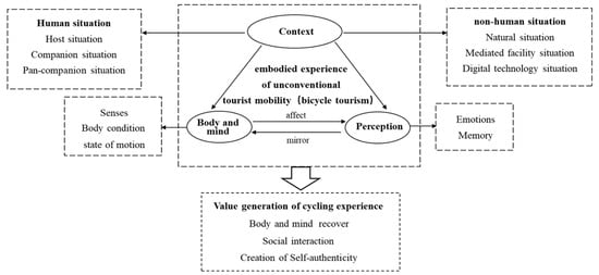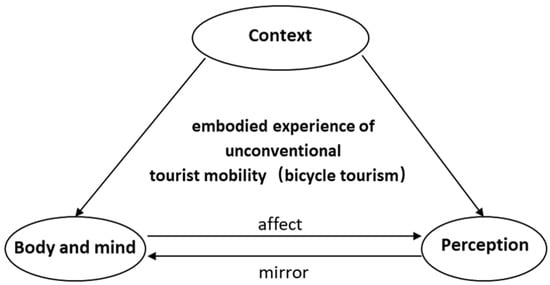 This article combines the objective space, body space, and the third space (perceptual space) proposed by Merleau-Ponty, and uses the conceptual framework of an embodied experience, including body and mind, perception, and context (Figure 2), to explore the process of diverse bicycle tourism experiences [25]. Our conceptual framework emphasizes that the interaction between body, perception, and situation influences tourists’ meaning construction and cognitive outcomes in tourism spaces and explores the specific effects of diverse situations on tourists’ physical experience and perceptual outcomes.
