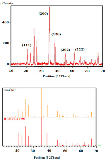 The morphology and size of the prepared Ni-TG nano-catalyst were analyzed by using different characterization techniques. The XRD technique was used for investigating the size, elemental composition, and crystal structure of the nano-catalyst. The XRD pattern was calculated by basal reflection peaks d (001) as shown in Figure 1. The detected diffraction peaks were compared with the Joint Committee on Powder Diffraction Standards (JCPDS), The sharp diffraction peaks confirm the good crystallinity of the synthesized nano-catalyst. The database diffraction points observed at angular positions of 2 θ value at 20.71 (110), 22.78 (020), 25.08 (111), 26.82 (021), 35.23 (200), 38.71 (130), 45.40 (202), 51.31 (222), 55.20 (042), and 66.80 (331) were in accordance with the standard database (JCPDS file No. 01-072-1195). The diffractogram of the catalyst sample showed the d value (basal spacing) appearing at 4.30, 3.92, 3.56, 3.34, 2.55,2.33,1.99, 1.78, 1.66, and 1.39Å, respectively. The average crystalline size was calculated using the Debye–Scherrer formula (Equation (3)) and was 39.29 nm. In the present study, the calculated average particle size confirmed that the NiSO4 particles synthesized from the green method are in nano size. In [47], the synthesized and characterized NiO green nano-catalyst was used. The intense diffraction peaks were observed at 2 θ (37.42, 43.4, and 62.89) which are assigned to (111), (200), and (220) planes. The crystallite size of NiO nanoparticles is 8.15 nm and it was predicted from the (200) plane. In the present study, the dominant peak is also observed at the (200) plane due to the occurrence of several phytochemicals in Tragacanth gum exudate which plays a significant role in the reducing and capping agent to the synthesize green nano-catalyst [48]. X-ray diffraction results of the NiSO4 modified TG nano-catalyst were found in accordance with SEM.