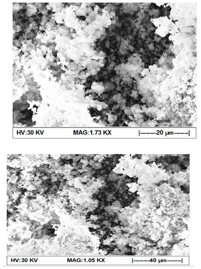 The surface morphology of the Ni-TG nano-catalyst was studied by SEM. The SEM micrographs of the Ni-TG nano-catalyst at different magnifications are shown in Figure 2 with different morphology after calcination at 500 °C. The physical properties of NiSO4 were influenced by the addition of the surfactant (TG). The synthesized nano-catalyst exhibited a semispherical and ovoid shape. Nano-catalysts with varying sizes were observed in the present analysis. An agglomeration observed at some places on the surface was due to TG support. The micrographs recorded at different magnifications confirm the presence of micro pores among those micro grains [40,49]. SEM micrographs confirms the uniform distribution of Ni at the micrometer scale. The surface morphology of the NiO nano-catalyst mentioned in the literature is spherical and cubic in shape. However, in comparison, the present study has shown a slightly different shape of the synthesized Ni-TG nano-catalyst (spherical and ovoid) with microporous morphology that further enhances the catalytic activity of the nano-catalyst for biodiesel production.
