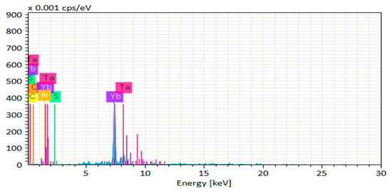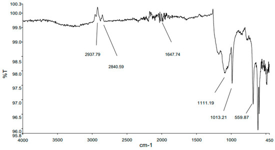 Different functional groups present in Ni-TG nano-catalyst were analyzed from the FT-IR spectra (Figure 5). The spectrum shows different peaks with a broad band in the region of 4000 cm−1–450 cm−1. The presence of the absorption band at 2937.79 cm−1 is owed to weak -OH stretching vibrations of adsorbed phenolic compounds with nickel metal ion. The peak that appeared at 2840.59 cm−1 represents weak -CHO stretching. At peak 1674.74 cm−1, the absorption band was detected with -OH bending vibrations and aromatic rings, comparable to previously described work in the literature [51]. Two strong intensive peaks were observed at 1111.19 cm−1 and 1013.21 cm−1 which exhibited the sulfate group symmetric and asymmetric vibrations of S-O and S=O. The peak that appeared at 559.87 cm−1 was related to Ni-O. In [52], the authors also found absorption peaks similar to the present study. Both the phenolic and aromatic compounds as a capping were also observed in the previous literature [53]. So, overall FTIR results conclude that the nano-catalyst synthesized using plant gum exudates is capable of acting as a reducing and stabilizing agent.
