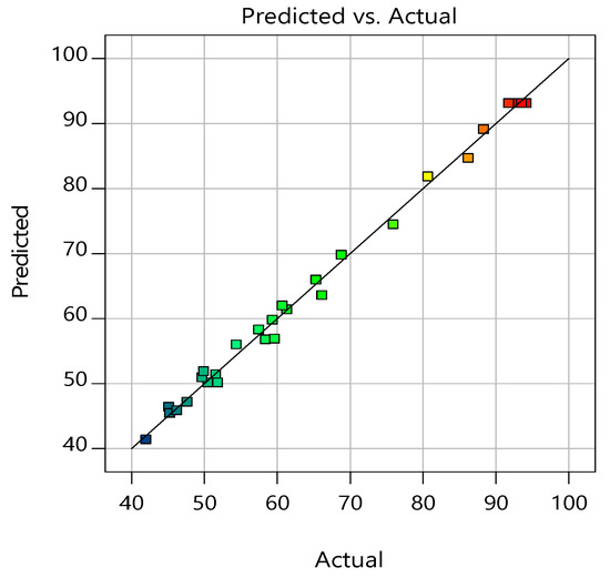 ANOVA results (Table 2) measure the fitness of the model, the parameters show the model F-value (223.95) is significant with a p-value (8.5), whereas the F-value corresponding to lack of fit (4.71) with a p-value (0.05) is insignificant with pure error, indicating that the model is fit with experimental (trial) data. The determination of coefficient value R2 = 0.995% confirms the model variability 99.5 %. The difference between the predicted R2 value (0.990) and the Adjusted R2 value (0.974) is less than 2, confirming the good correlation with regression polynomial. Furthermore, the adequate precision value (42.34) is greater than 4, indicating the suitability of this model to navigate the design in space, thus predicting the biodiesel yield [54]. Additionally, in Figure 6, the straight line shows a close agreement between the experimental and predicted biodiesel yield. The 3D graph in Figure 7A–F depicts the interactive effect of four independent variables on the transesterification process for biodiesel production.