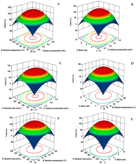 3D Graphs (A–F) presenting the influence of various reaction parameters on Brassica juncea (L.) Czern. biodiesel yield.